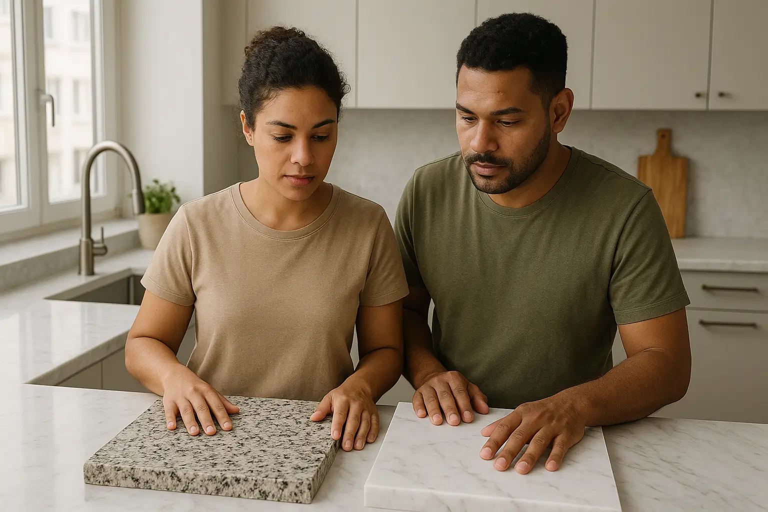 O granito é uma rocha mais dura e menos porosa, ideal para áreas de alto tráfego como bancadas de cozinha. O mármore é mais poroso e macio, valorizado por sua beleza e veios únicos, sendo a escolha ideal para ambientes internos como banheiros e painéis decorativos.