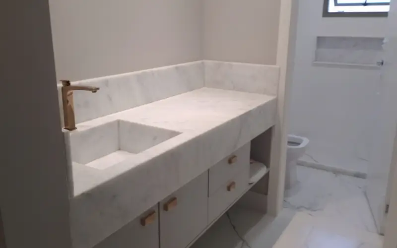 Bancadas de cozinhas e banheiros em mármore e granito – peças únicas que elevam o nível do projeto.